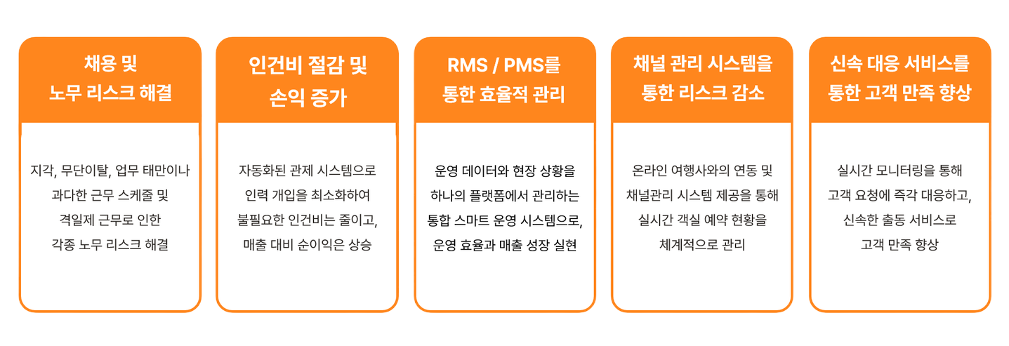 예약관리 / 결제 및 체크인 / 컴플레인 무인 응대 / 매출 관리 / 객실 관리 / 미성년자 필터링 / 화재출동 서비스